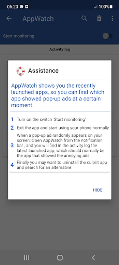 3 - When a pop-up ad randomly appears on your screen; Open AppWatch, and you will find in the activity history, the latest launched app, which should normally be the app that showed the annoying ads.