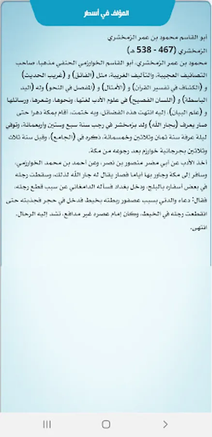 Tafsir Al-Kashshaf application contains the interpretation of Al-Kashshaf by Al-Zamakhshari with the browsing feature for verse by verse interpretation.