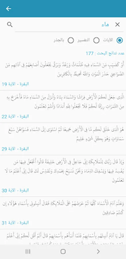 - Searching for any verse through the root of the word, it will give you results in the verses whose words are derived from the search word.