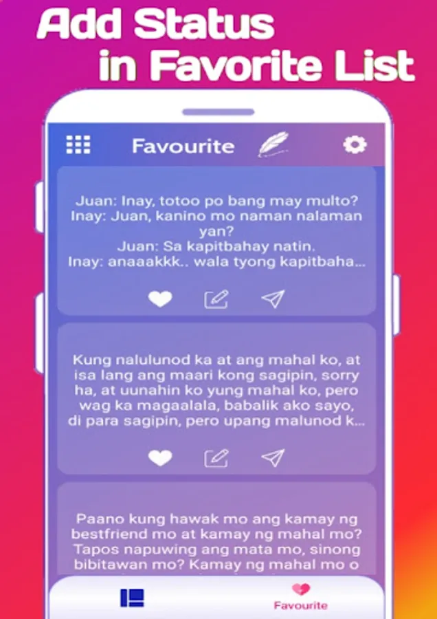 Tagalog Status is a collection of beautiful status, funny, sad love status made for the young at hearts that you will surely loved This app. The simple interface lets you enjoy, copy and share the quotes easily your love one or friends.