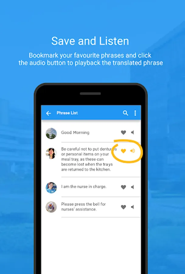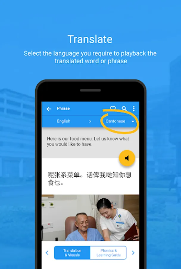 The library contains mainly healthcare specific phrases, such as “Do you have any drug allergy?”, “Please use the call bell to ask for help.” etc. There are also general phrases, such as “Good morning” and “What is your name?”. All phrases have been thoughtfully crafted to strike a balance between formal and colloquial way of speaking in Singapore.