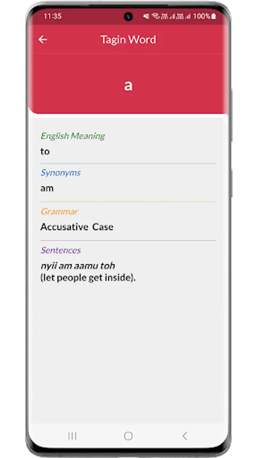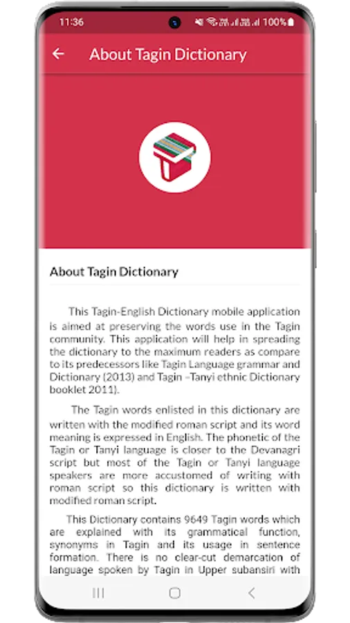 This Tagin-English Dictionary mobile application is aimed at preserving the words use in the Tagin community. This application will help in spreading the dictionary to the maximum readers as compare to its predecessors like Tagin Language grammar and Dictionary (2013) and Tagin –Tanyi ethnic Dictionary booklet 2011).