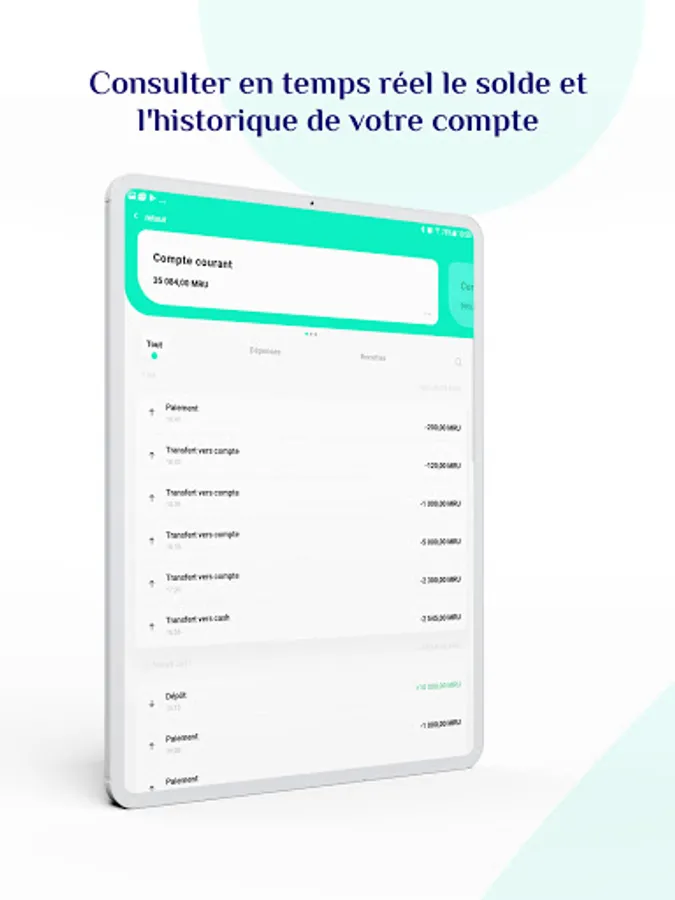 Download the application to remotely create your account and carry out your banking operations: withdrawal and deposit of cash, money transfer, payment at the merchant, payment of your invoices, recharging of telephone credit, payment of your employees' salaries and many other features.