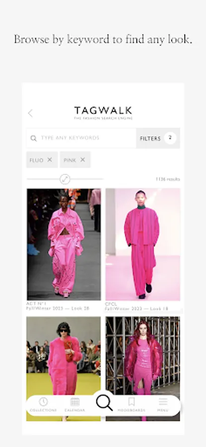- Fashion Search Engine: browse by keyword through the latest collections and filter them to get the one look you want. Are you looking for a red dress from the past Spring/Summer 2022 fashion shows? Simply type « red » and « dress » in the search bar and all of the looks will come up.