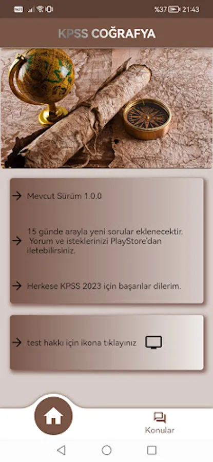 Our application, which has questions and questions for kPSS geography, is divided into questions in full KPSS consistency, pile and easy. Updates will be made every 15 days until KPSS. You can send us your suggestions and opinions via play store.