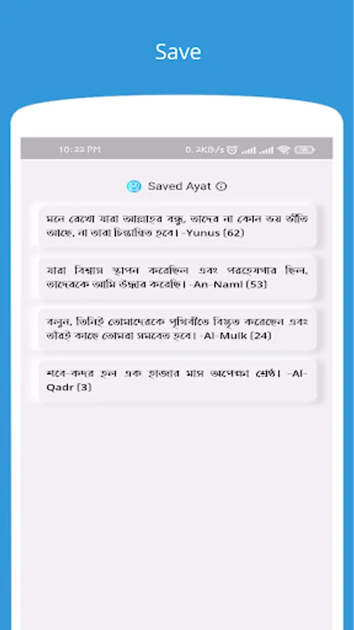 Every time you open the app or refresh the app this app will pick a random ayah from Al-Quran for you. You can read and share with others and save to make a personal collections of ayah.