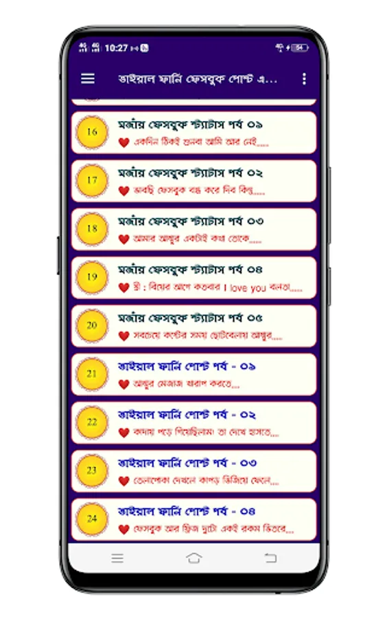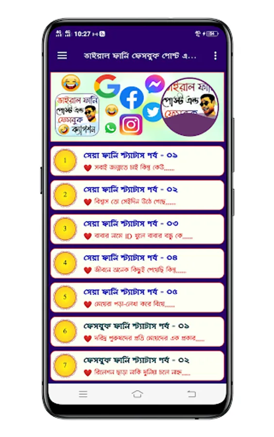 আপনাকে আর কষ্ট করে মজার মজার স্ট্যাটাস খুজতে হবে না এই অ্যাপসটিতে আছে অনেক অনেক মজার স্ট্যাটাস আর ক্যাপশন।