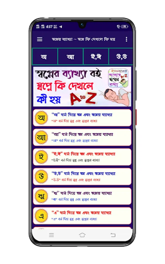 ক,খ,গ,ঘ,ঙ,চ,ছ,জ,ঝ,ঞ,ট,ঠ,ড,ঢ,ণ,ত,থ,দ,ধ,ন,প,ফ,ব,ভ,ম,য,র,ল,শ,ষ,স,হ,ড়,ঢ়,য়,ক্ষ বর্ন দিয়ে স্বপ্ন এবং অ দিয়ে স্বপ্নের ব্যাখ্যা ।