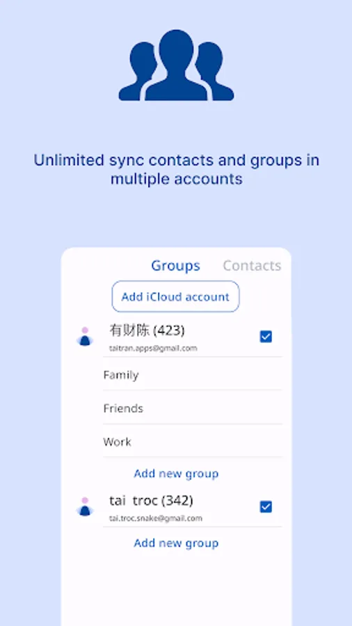 ICloud Contact is a Contact Editor and CardDav Client, which can synchronize contacts in iCloud Servers, With this app, you can share and synchronize contacts between Android devices and iDevices. In short, you can add, update, delete contact on Android phone and it will appear on iDevices.