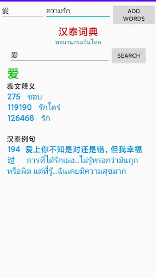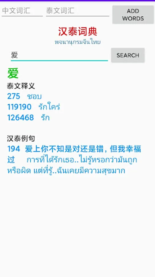 Authoritative example sentences: A large number of authoritative example sentences are collected, which come from bilingual corpus such as Chinese-to-Thai novels and papers that are popular.