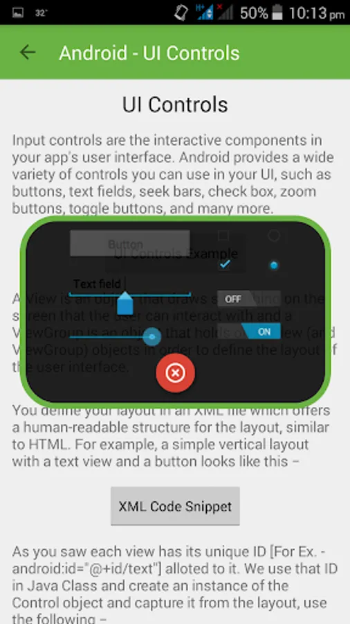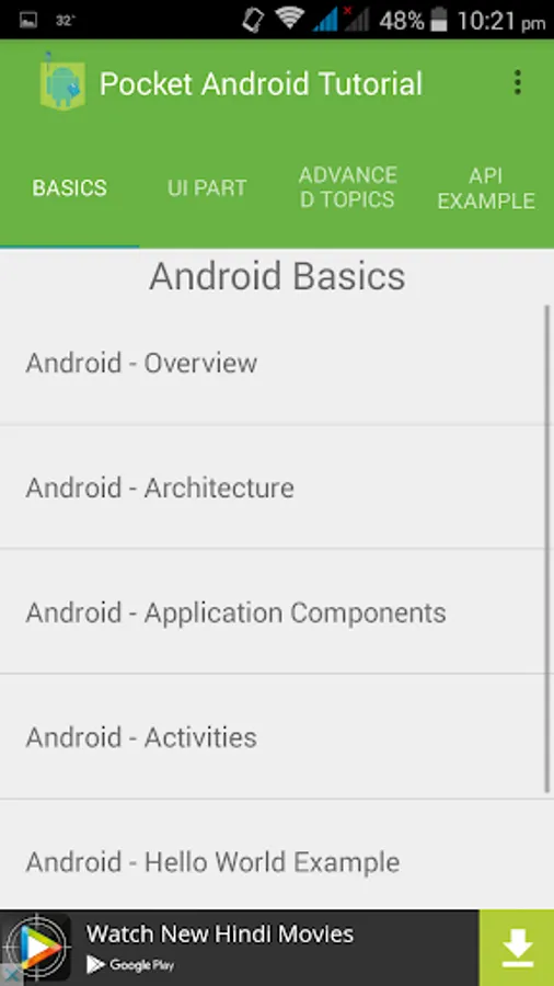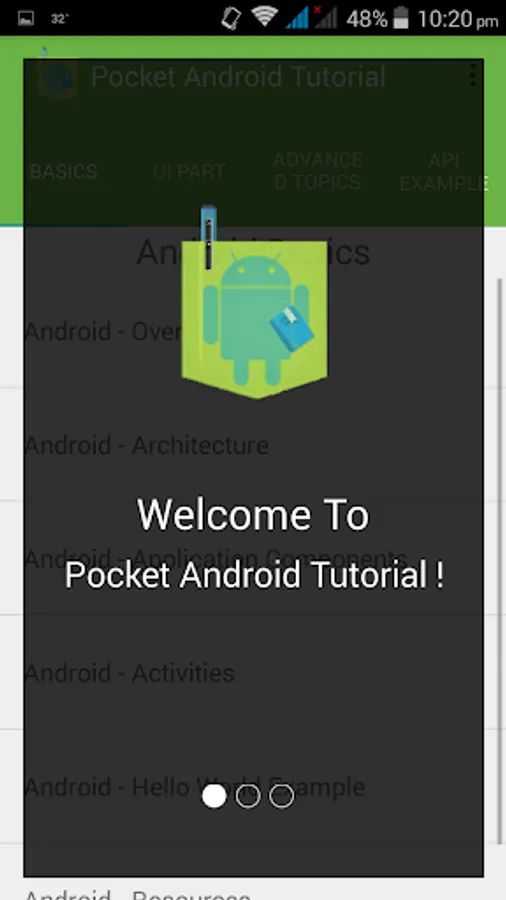 Pocket Android Tutorial is a guide to learn Android application development. It covers basic to advanced topics and some useful API examples of Android that enables user to start designing and creating their own applications!