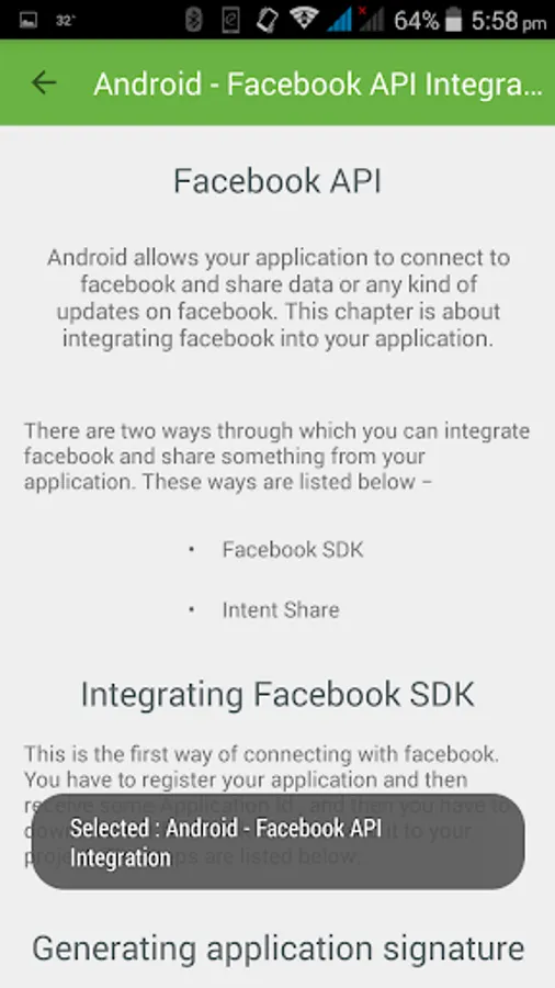 The last section is Android Examples that has some important API examples like WebView for rendereing Webpages, SQLite Database for storing local data inside Android device, Facebook API support, JSON Parser API, Animations, Alert Dialogs, etc.