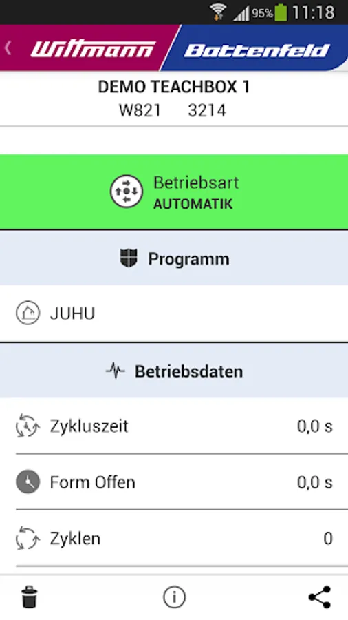 This App connects to Wittmann R8 robots and Wittmann Battenfeld Unilog B6 injection molding machines. You can use this app to quickly and easily look into the most important operating data and states of your devices.