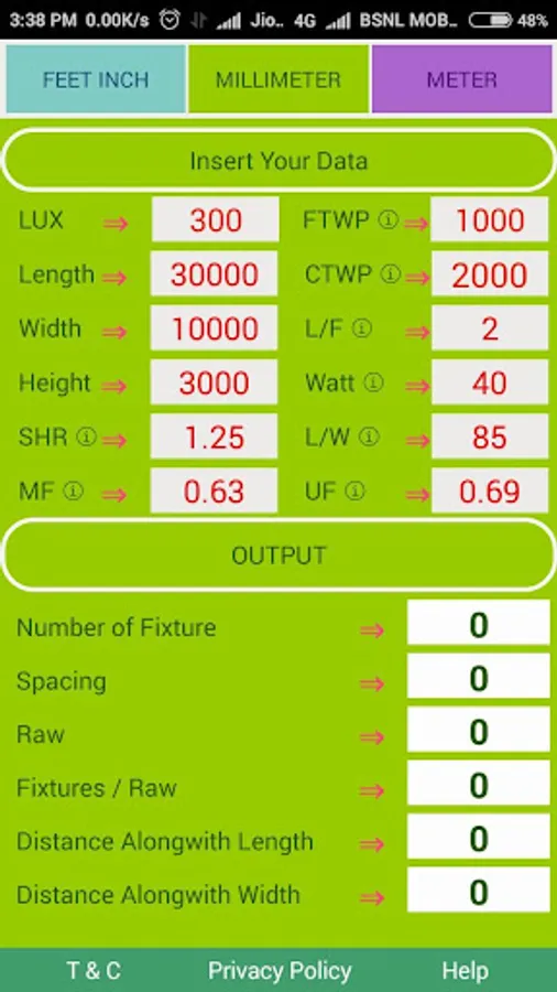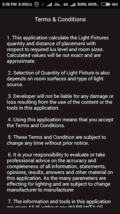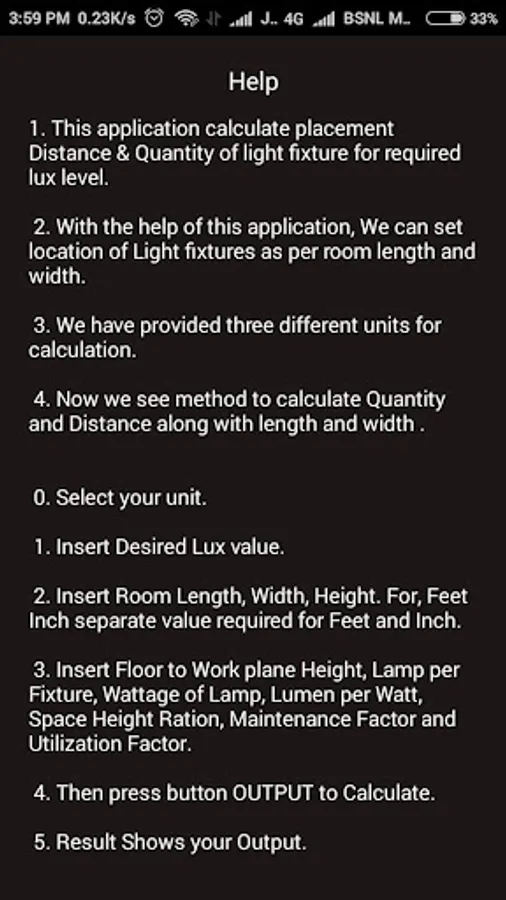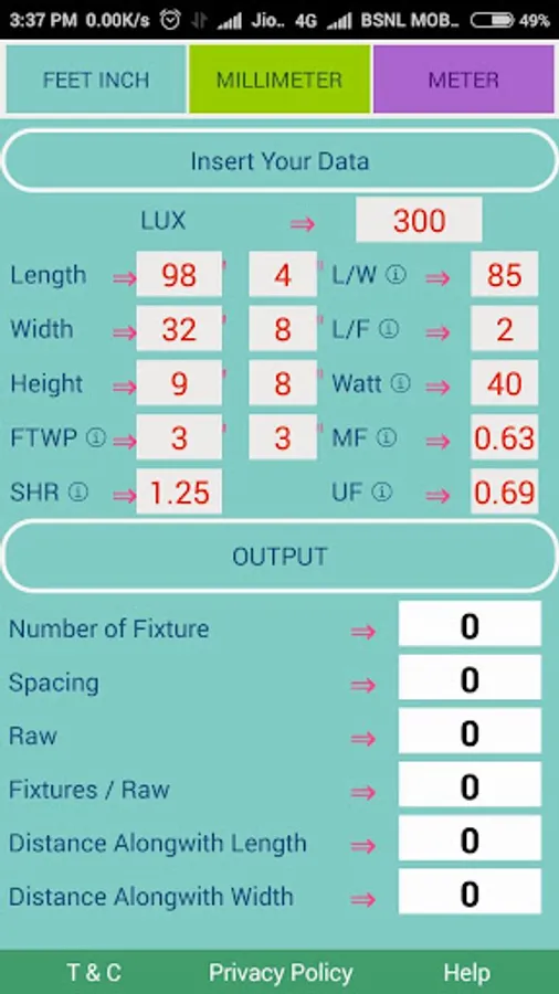 1. This application calculate the Light Fixtures quantity and distance of placement with respect to required LUX level and room sizes. Calculated values will be not exact and are approximate.