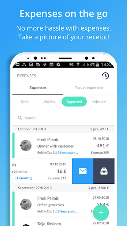 Expenses on the go: Enter expenses, mileage, and receipts using the camera, anytime and anywhere.