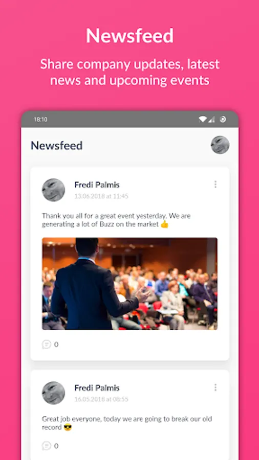 - Newsfeed to broadcast company-wide information to all the team members you have.