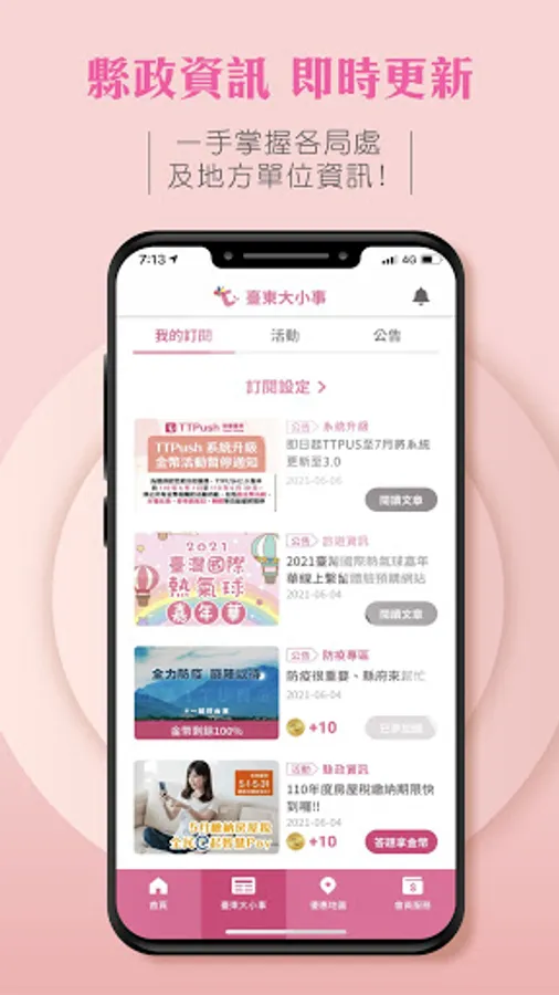 "TTPush Kick" is a thrust-based county administration APP launched by the Taitung (Taitung) County Government. It integrates the resources of the various bureaus and offices of the Taitung (Taitung) County Government, and proactively conducts county administration with a smartphone that is closest to every citizen. The information is pushed and broadcasted, and county government services are carried out in a more immediate, convenient and efficient manner, and the county government services of various units of the county government are taken to make the county residents feel. In addition to providing county government information such as land administration, civil affairs, and taxation, the pushed information content provided also covers practical information such as main theme activities and traffic information. The business accepted by the county government, such as county government policy promotion, official document release, childbirth subsidy, acceptance notice, etc., "active report" processing progress and active notification of referral services to county residents, from the past passive to active services .
