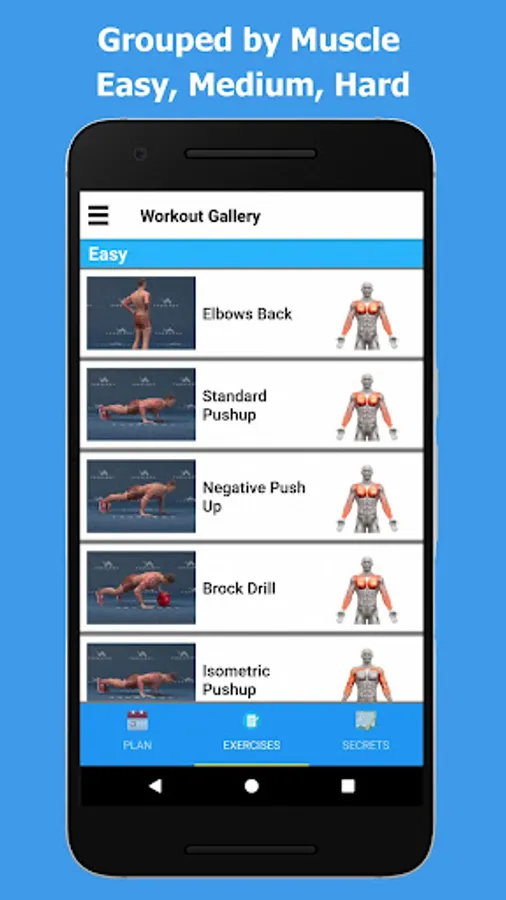 - Arm workouts exercises are grouped by muscle group with difficulty level (easy, medium, hard). Video showing how to do each arm exercise.