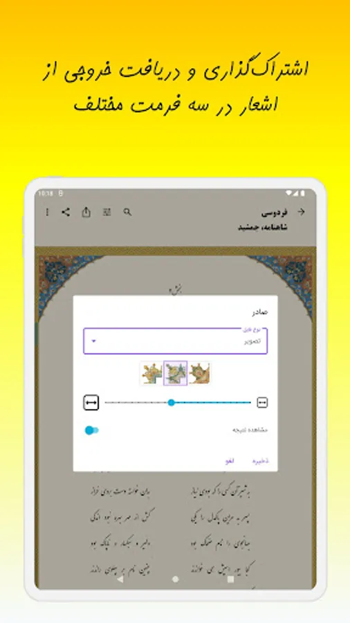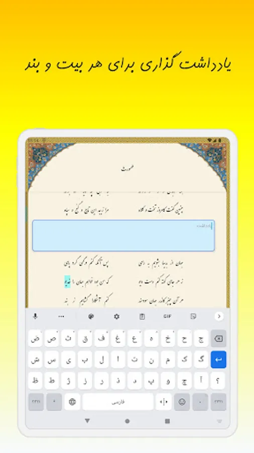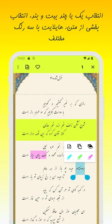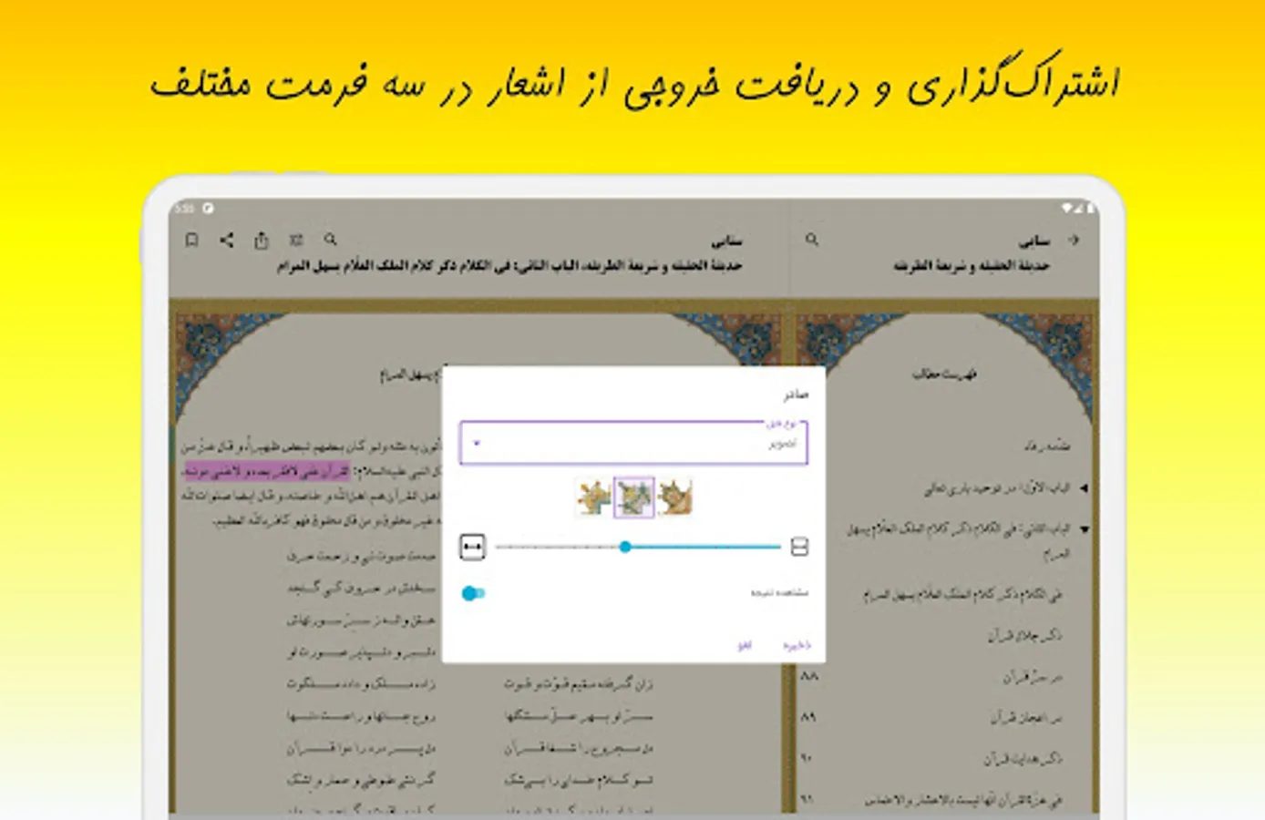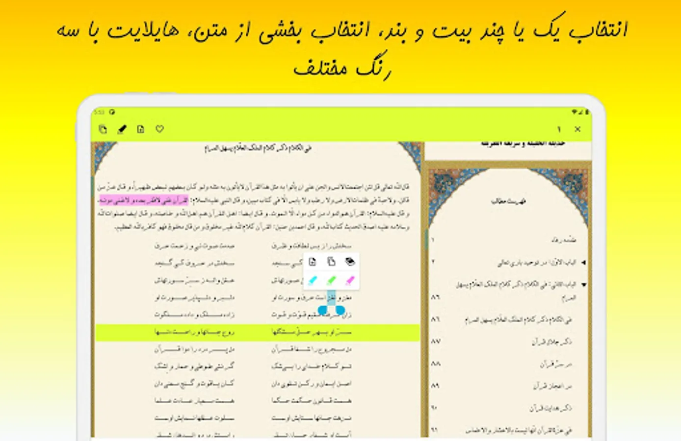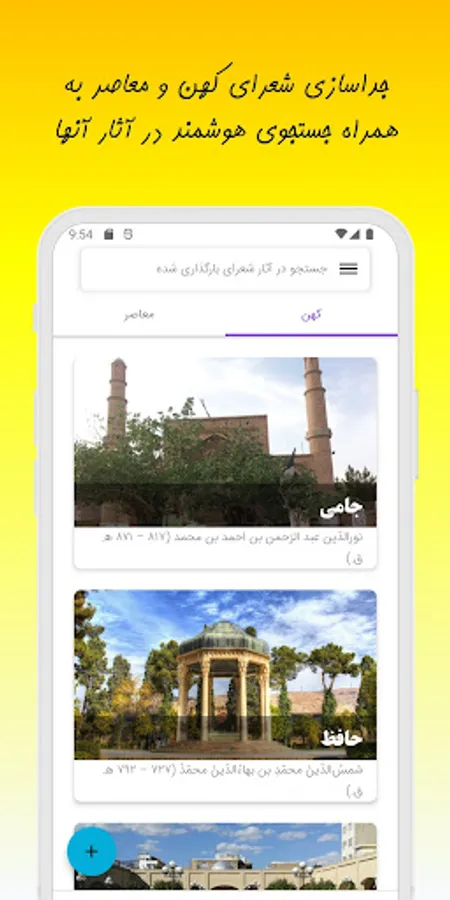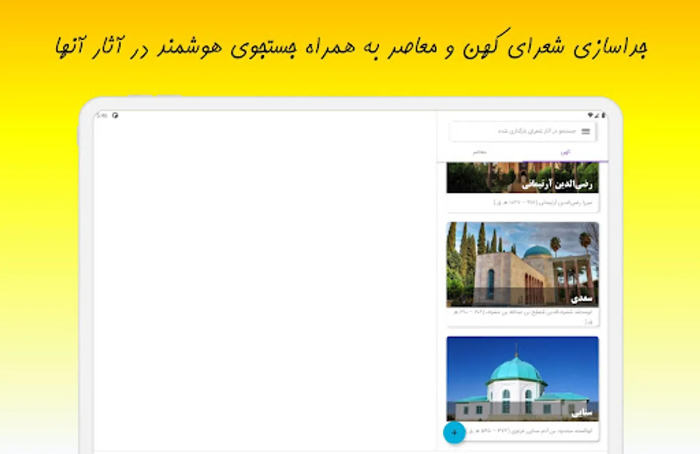 • Smart search: search results in this app are sorted smartly according to relevance of verses and paragraphs to search phrases. Besides this, it is also possible to restrict the search results to a poet books or a specific book. User can search in a poem text too.