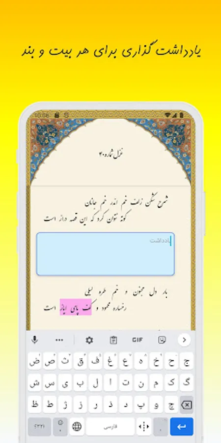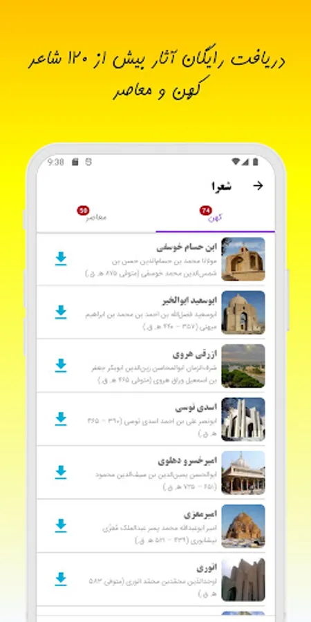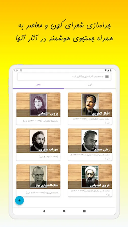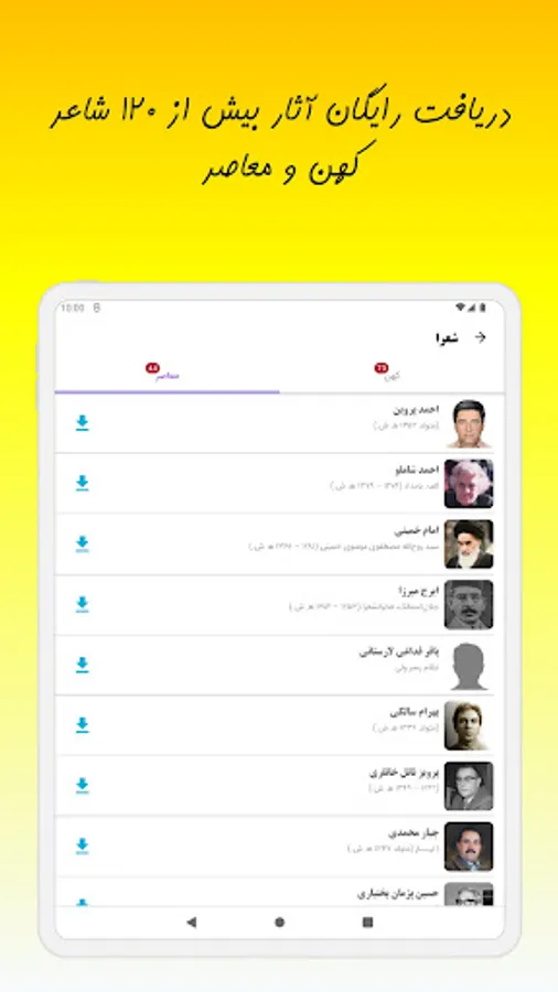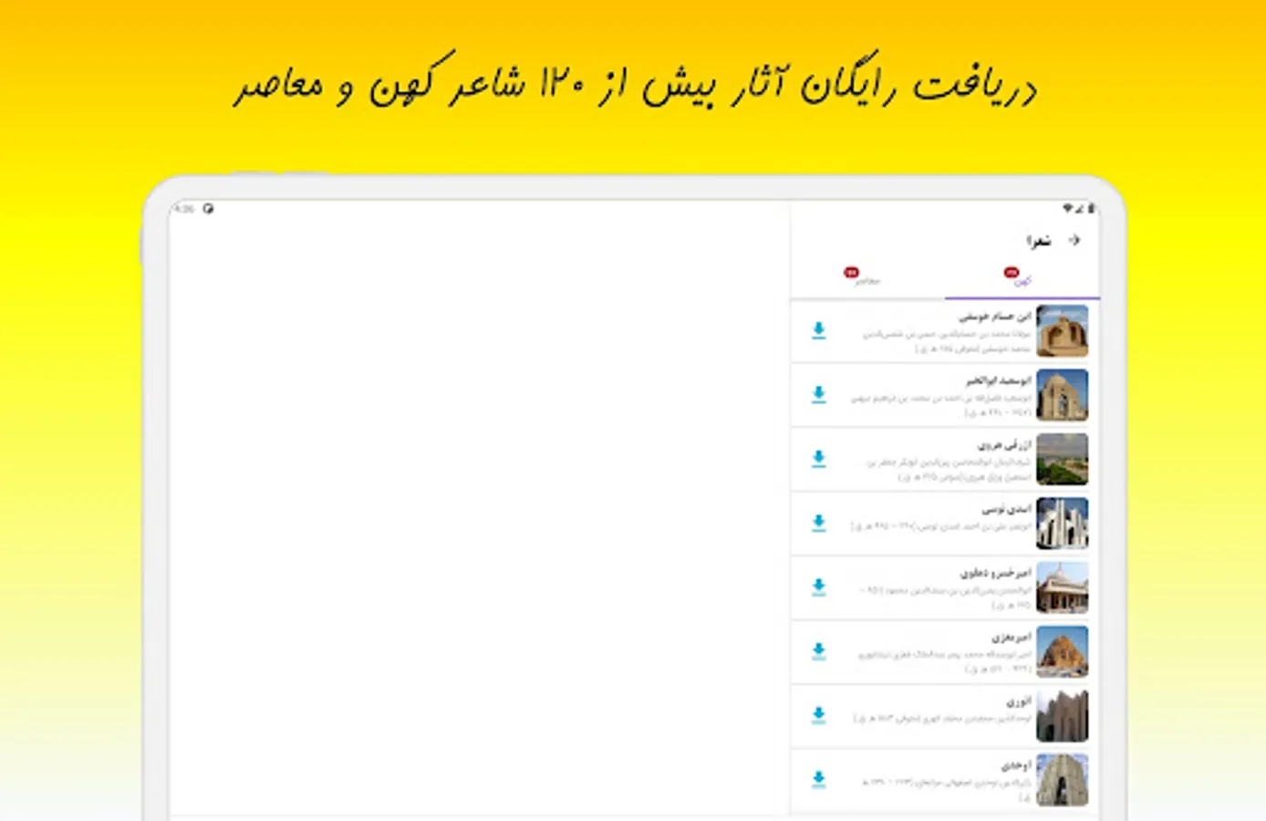 Poems of most of the ancient Persian poets and many recent poets have been included in this app which users can download them freely based on their need. Till now some similar apps have been published in Android markets, but this one has some features and advantages that users would prefer to them. These features include: