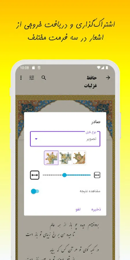 • Exporting: the app has the ability to save a poem in a file of type pdf, jpg or txt. Three beautiful borders can be chosen for pdf or jpg output files. User can set width of jpg file too.