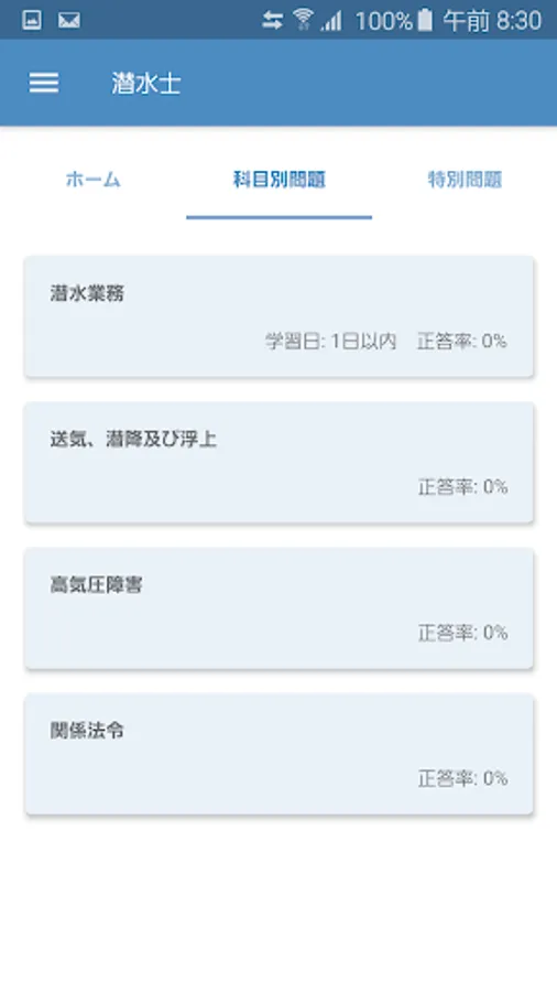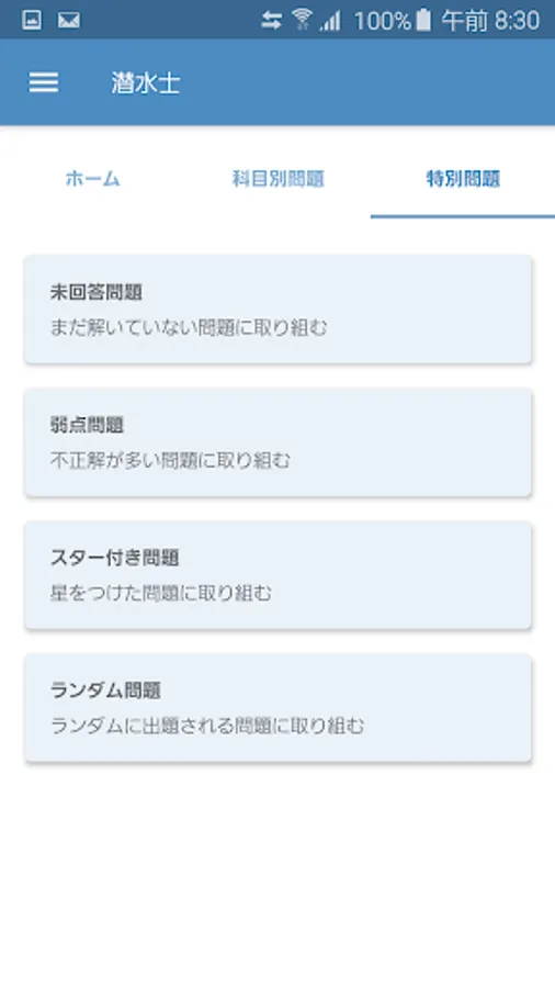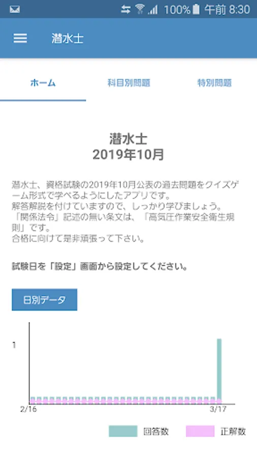 It is an application that allows you to learn past questions published in October 2019 of divers qualification test in quiz game format.