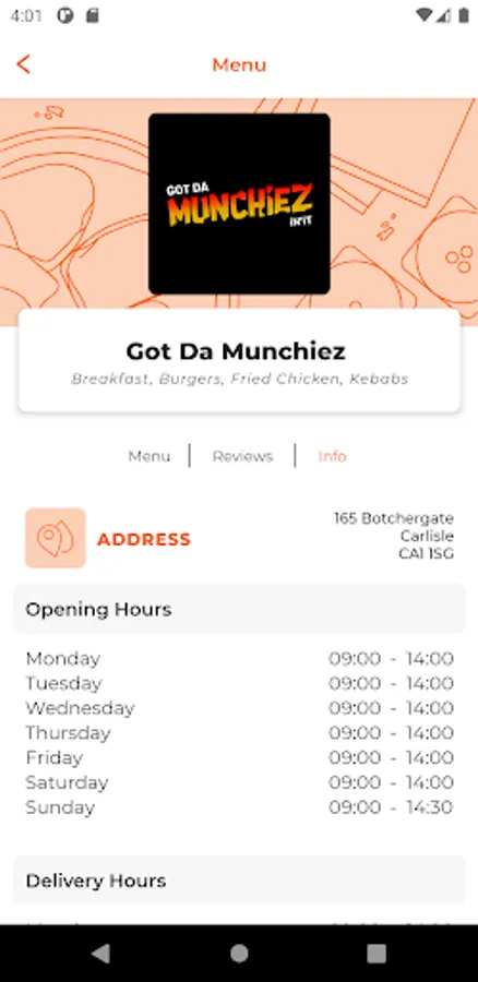Other helpful information includes a map of our takeaway location, opening hours and contact details.