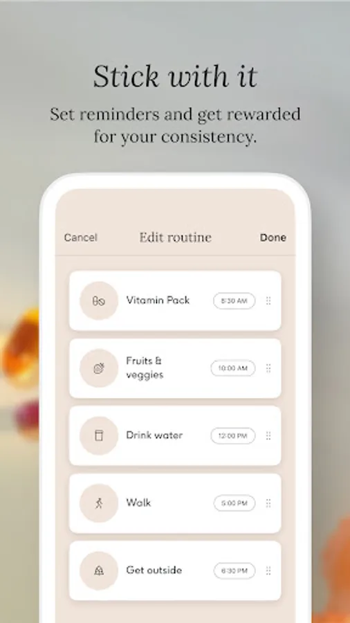 The Care/of app is designed to help you get more from your wellness routine. More guidance, more reminders, more results. It pairs feedback-loop psychology with personalized recommendations to help you create healthy habits and stick with them for good.