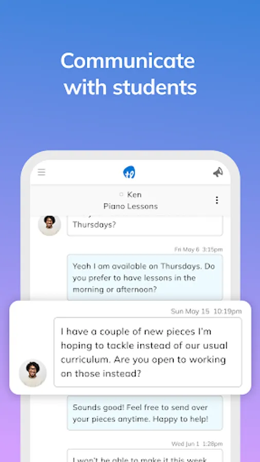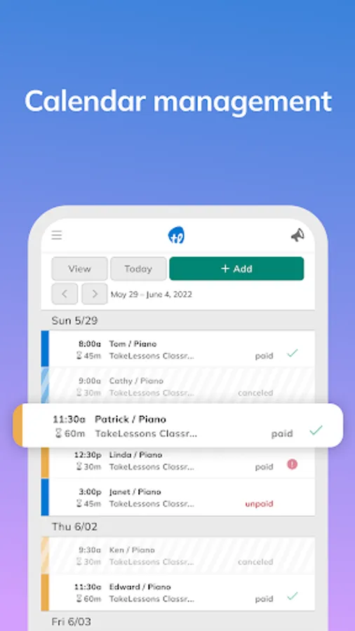 The TakeLessons for Teachers app is a companion to your online account on TakeLessons.com, designed to give you a streamlined experience to help manage your schedule on the go. Your free online account gives you access to even more features to manage your business.