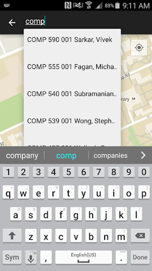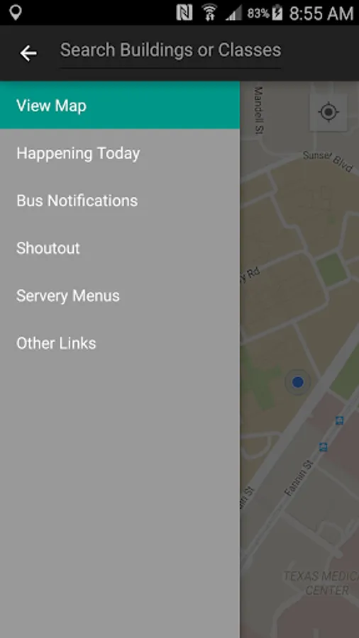 Map: Shows map of campus, building locations, class locations, points of interest, and bus locations in real time.
