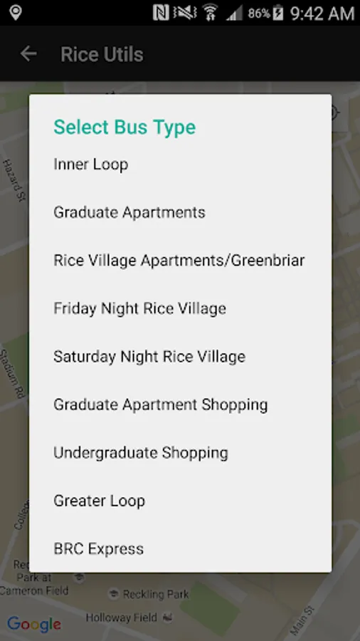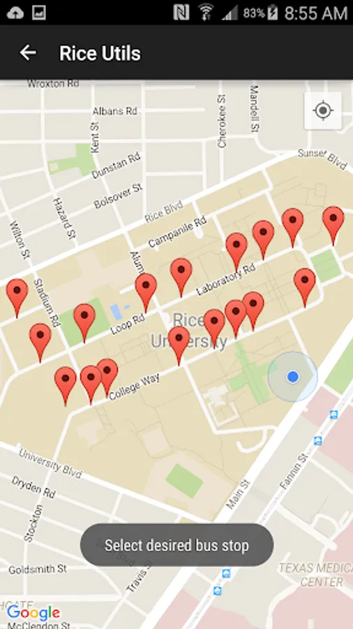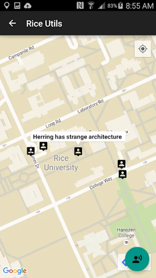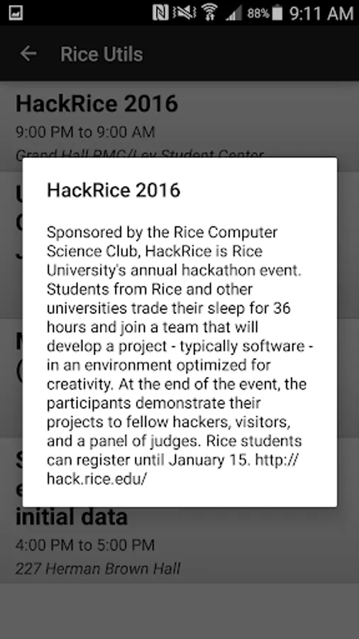 Provides several utilities including a map of the Rice University campus, list of daily events, bus notifications, a new social app, and helpful Rice related Links