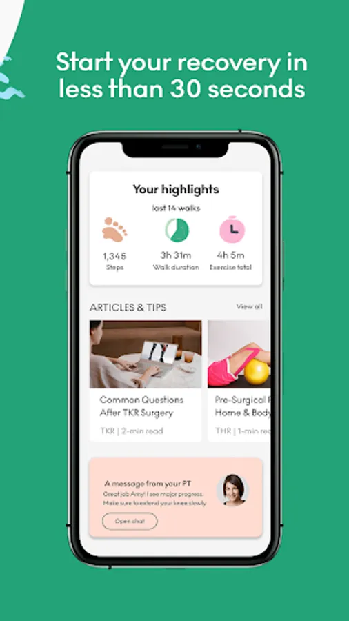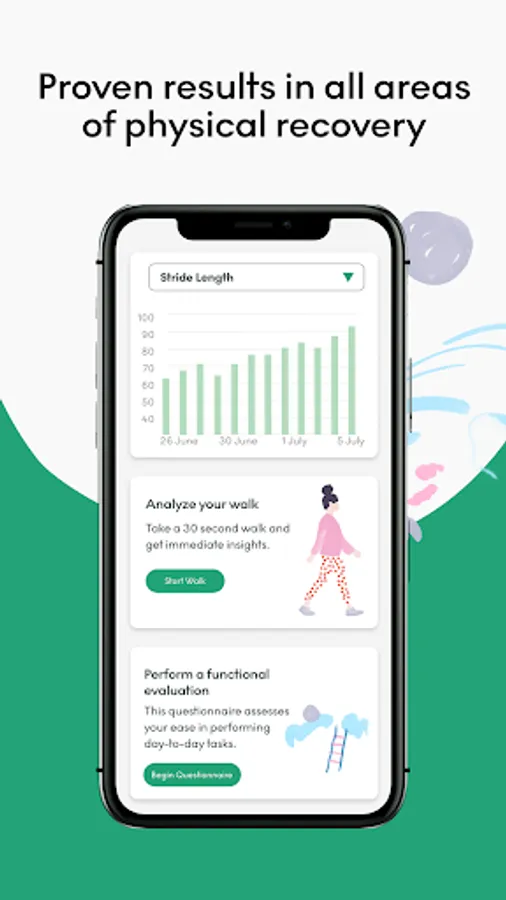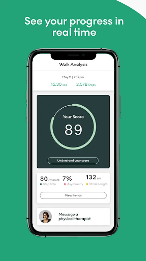 OneStep's smartphone-based motion analysis — the OneStep app is able to capture real-world movement during everyday activities such as walking, running, and negotiating stairs. Additionally, using the app patients can record joint range of motion and standardized functional mobility assessments. Results are shared with the patient and automatically transmitted to the OneStep clinician portal for remote therapeutic monitoring (RTM).