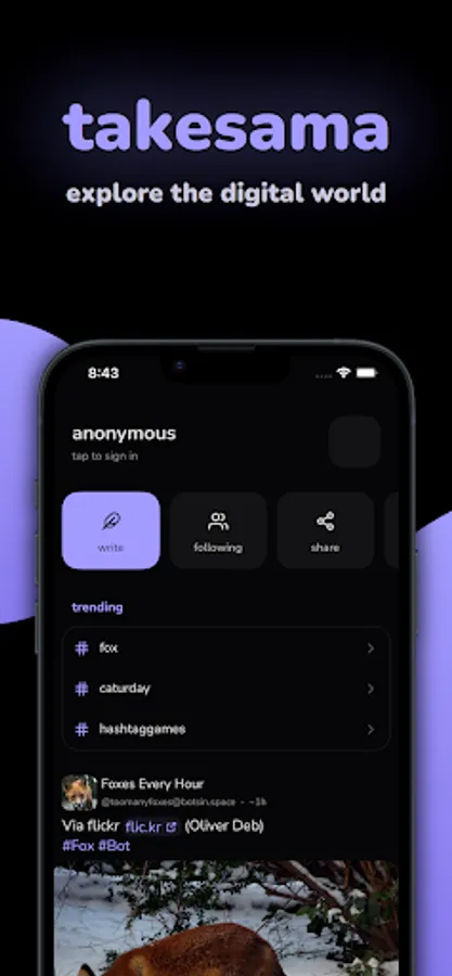 Connect with friends and uncover new creators like never before with takesama! Seamlessly log in using your Mastodon, Misskey, or Firefish accounts, and open the door to a world of limitless possibilities.