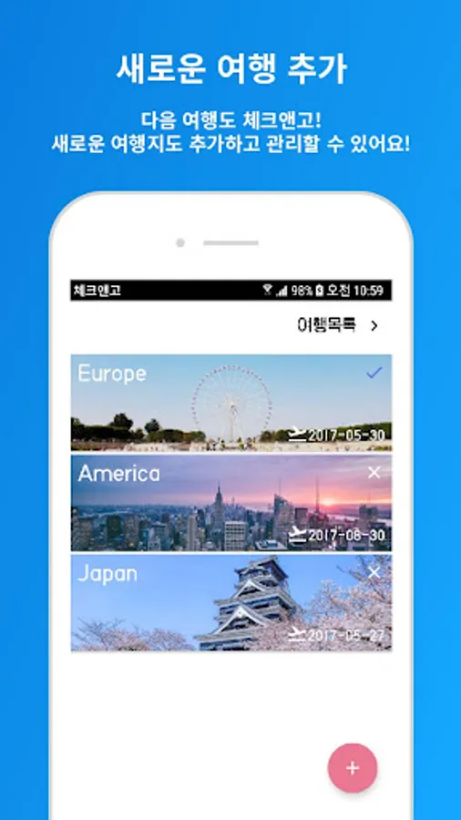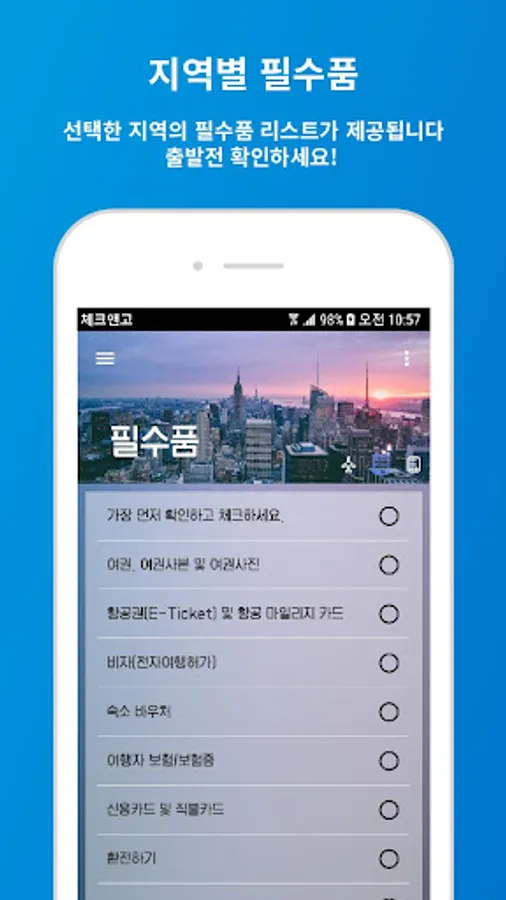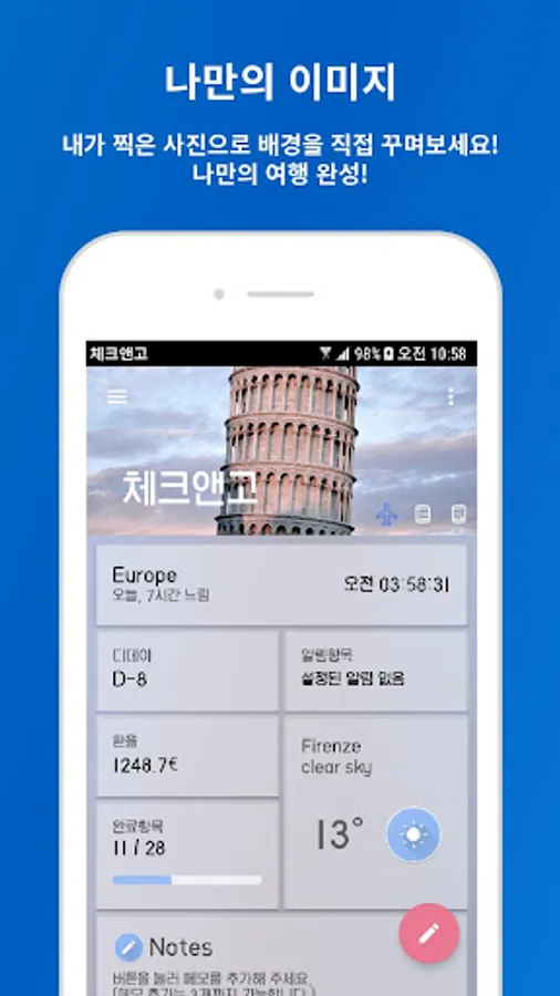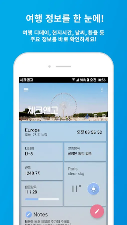 Check the list of apps and logos are traveling necessities check. It provides key information such as destination of CNN, D-Day, the exchange rate, and weather. Check the list of necessities provided by the Travel Plan your perfect trip!