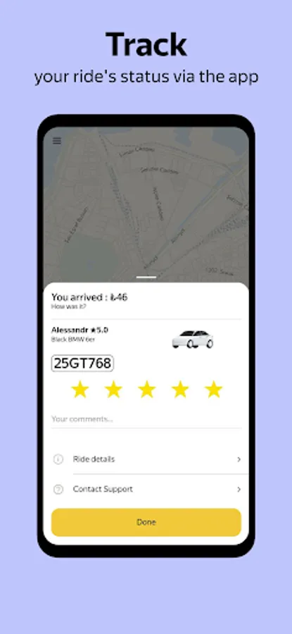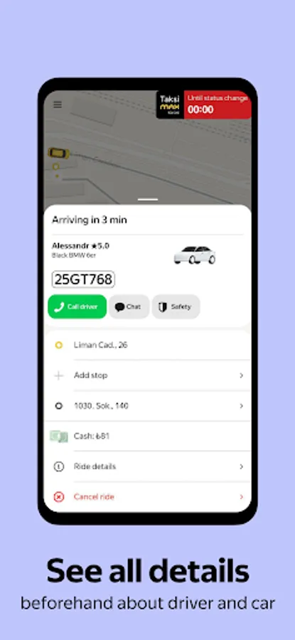 You can always see the driver's name, the car number and it's color when you order a ride right in the app. If you have questions or difficulties, you also can contact the driver if any via in-app chat — convenient and safe. You can use any language — we will translate it automatically for you.