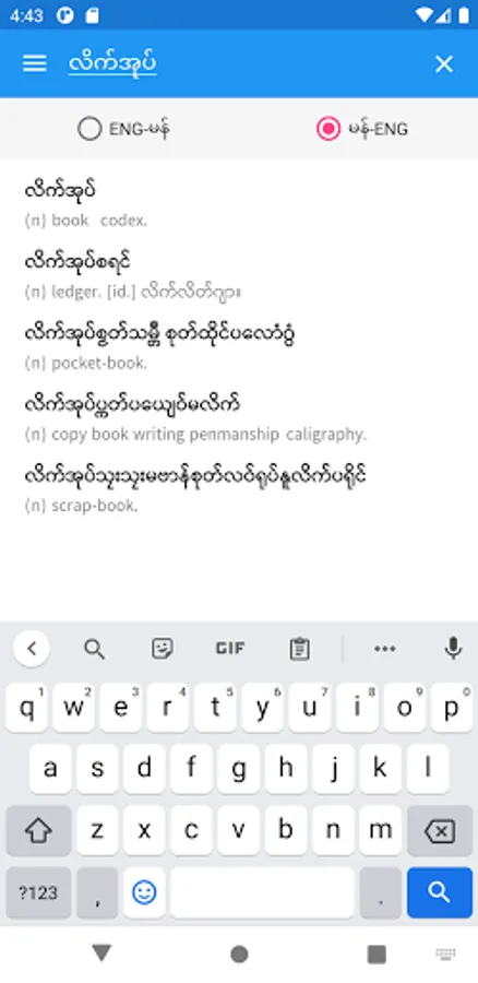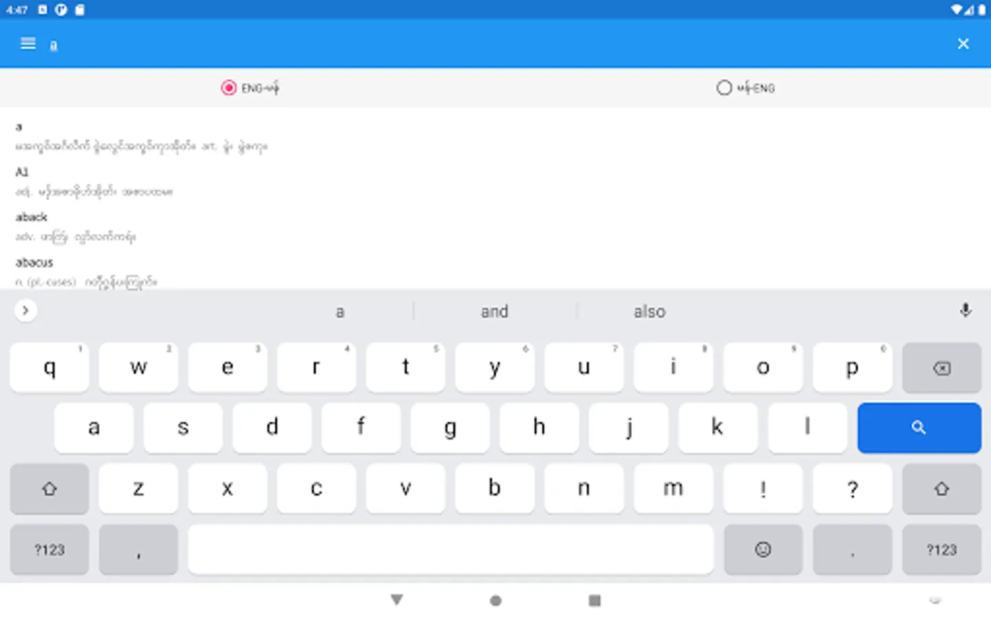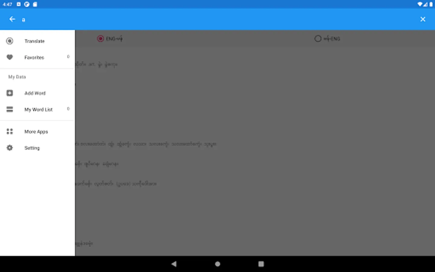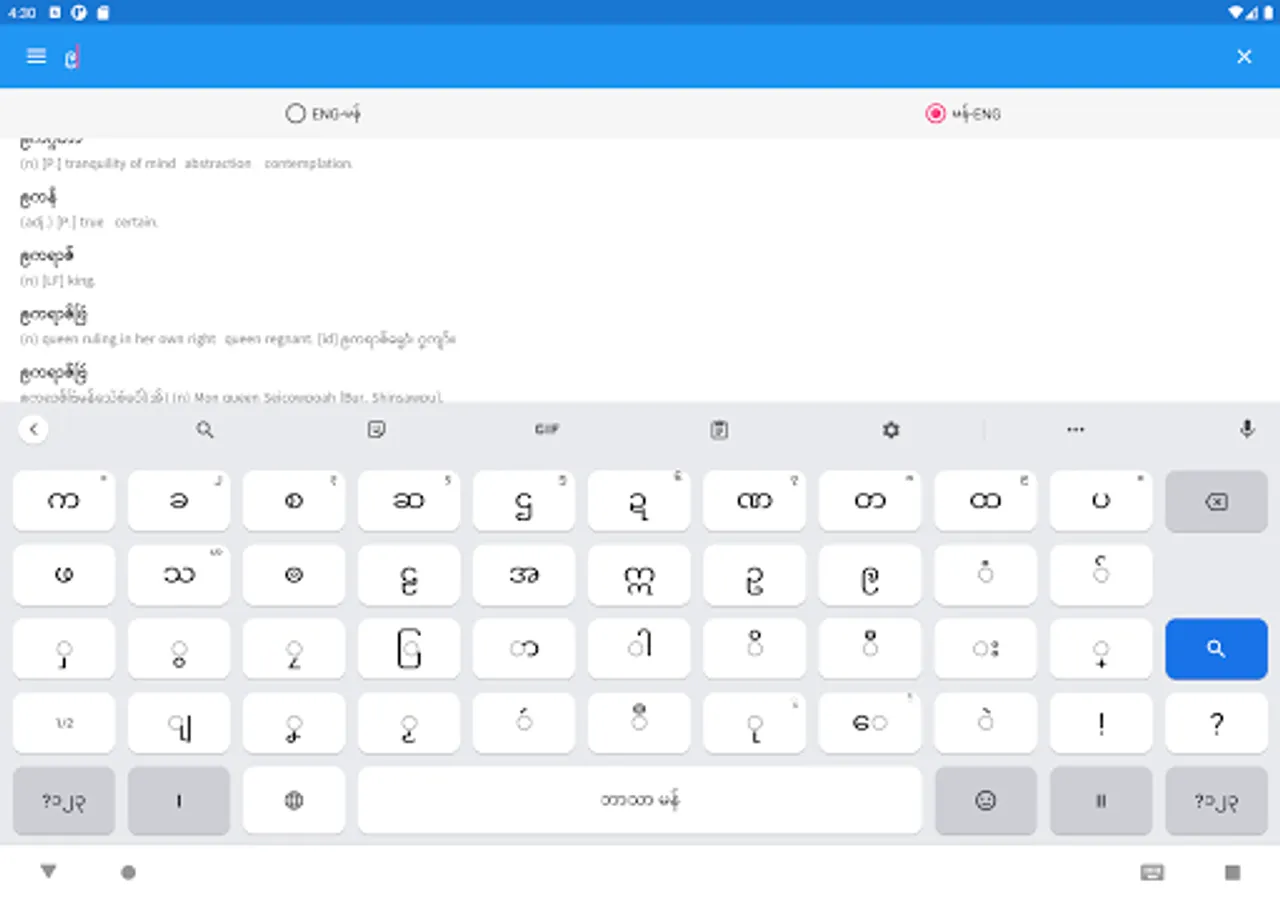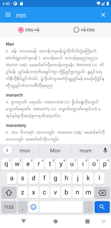 This dictionary can be translated between English and Mon. We will try to add more words in the future.