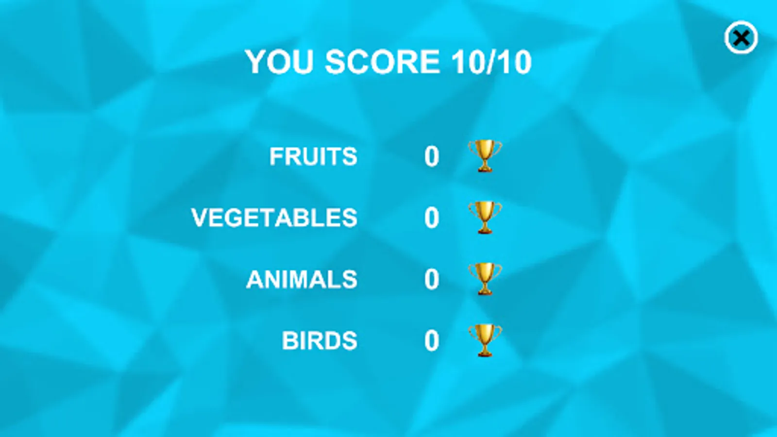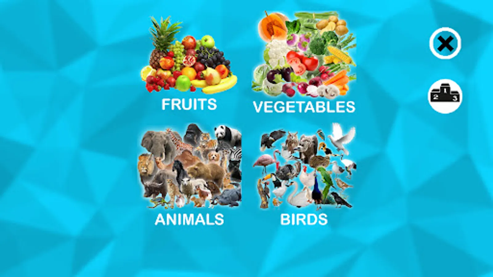There are 4 differnet types of pictures i.e FRUITS, VEGETABLES, ANIMALS, BIRDS.