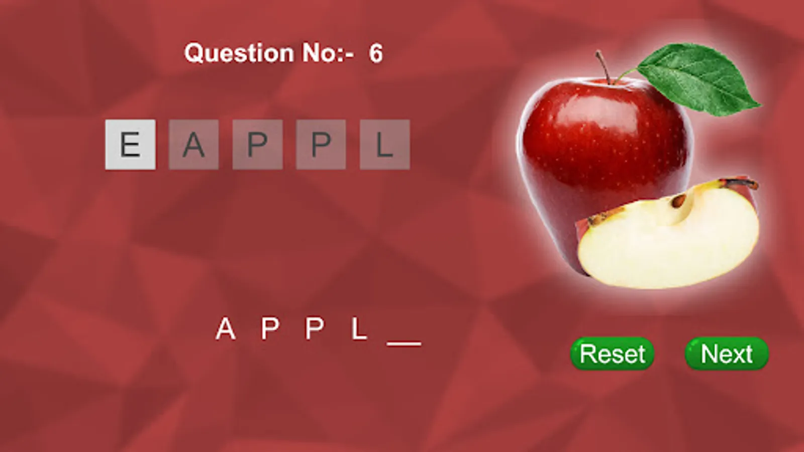 exmple an apple is shown in image, alphabet are give (pplea,alepp). simply select the alphadet to create a correct speeling/word.