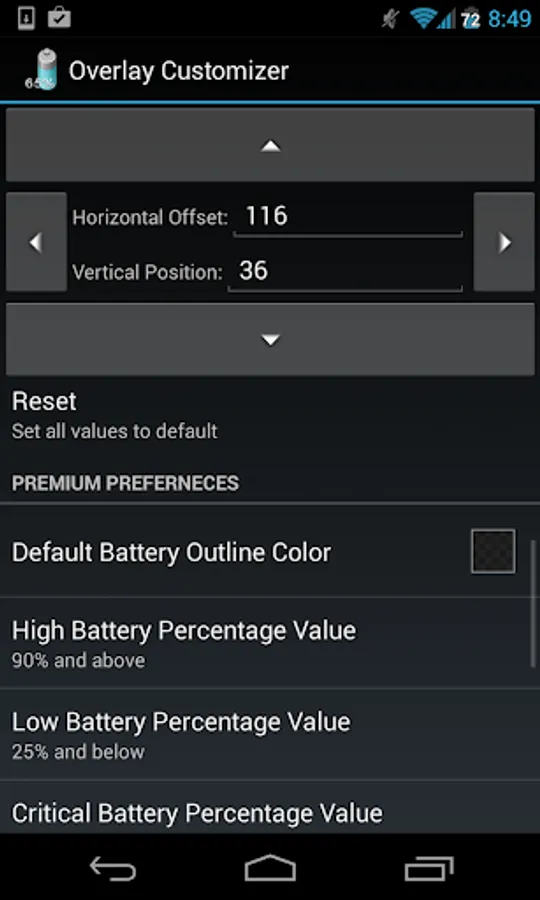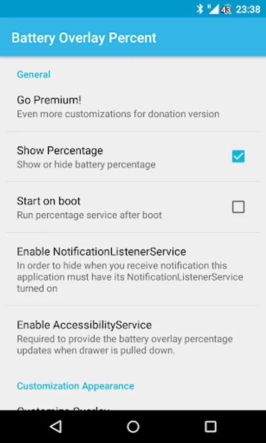 Battery Overlay Percent is the first truly customizable solution to keep your battery percentage showing without cluttering your notifications.