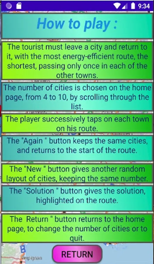 Intuitive interface for very fast games, and all different. Four to ten cities are arranged at random with an infinite number of positions.
