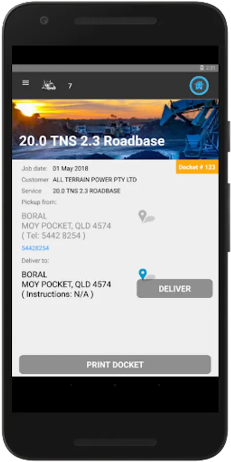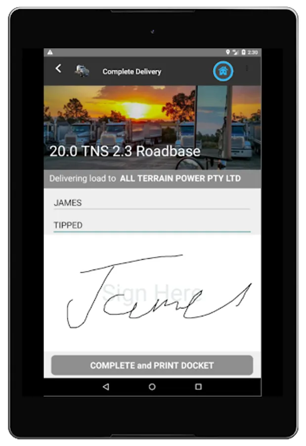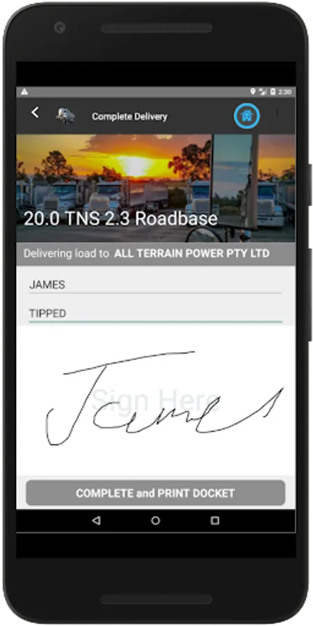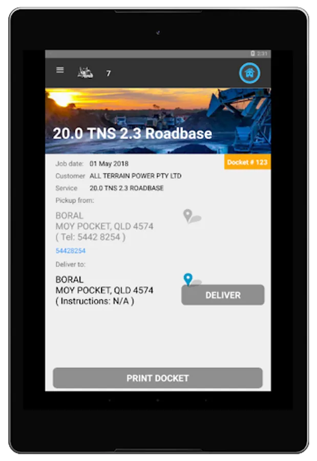 With in the app drivers will be able to easily navigate and update jobs state. Entering in weights and docket numbers for the job. Completing the job is easy with a name and signature captured for POD.