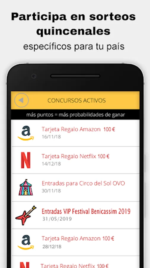 🔵 Awards : Throughout the process get points to win great 🎸 🎞️ 🍿 prizes, such as Amazon and Netflix gift cards, VIP tickets for contests, experiences, trips ...!