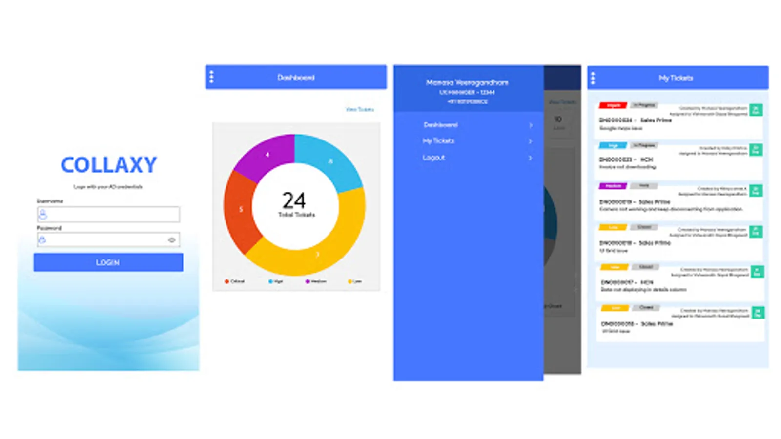 Collaxy is an enterprise app used by customers to view the status of the tickets they have raised and also can read the comments provided by the service team. Each ticket will have attributes like title, description, Assigned To, Created by, Created on along with the screenshots of the issue reported.