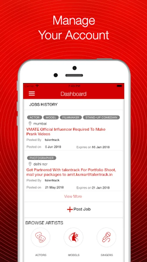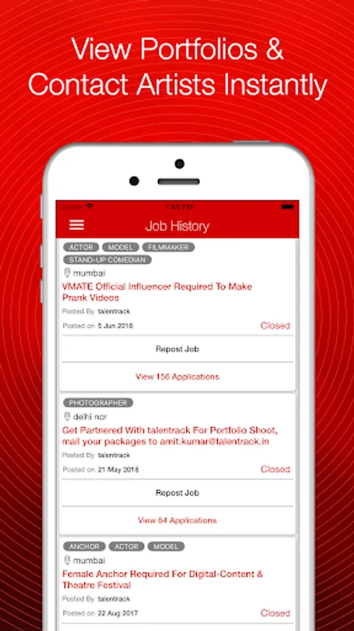 Talentrack Recruiter is a talent-hiring app for the Media & Entertainment industry. The app offers a vast database of creative talent to business/industry recruiters to choose from. Get a feature-rich dashboard on your phone to search, sort, connect and engage with artists - making Talentrack your single-point recruitment manager.