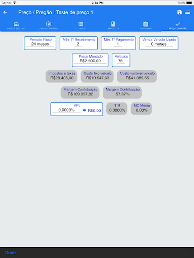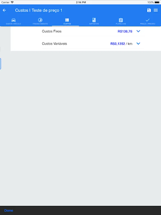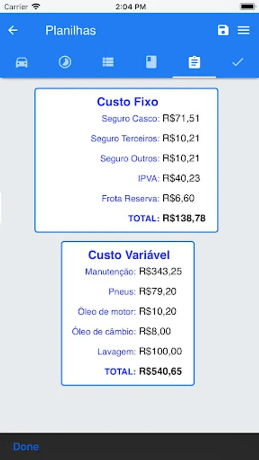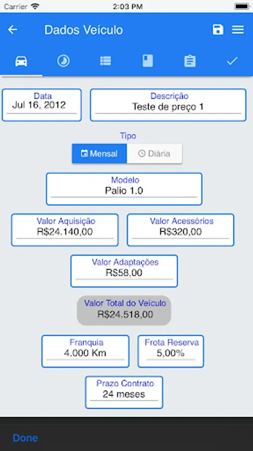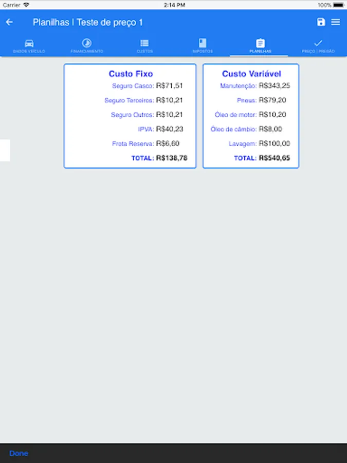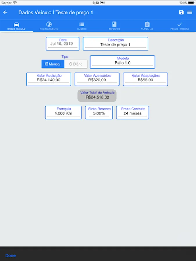 The calculation of the rental charge is performed based on the vehicle model and operating data, such as, distance traveled, spending on the acquisition, licensing, property taxes and insurance that form the Fixed Cost. The App considers the maintenance expenses as parts and service, cost tires, lubricant and washes, calculating in this way the variable cost of the vehicle.