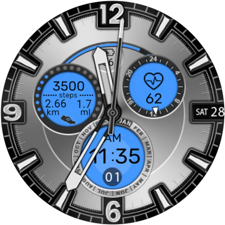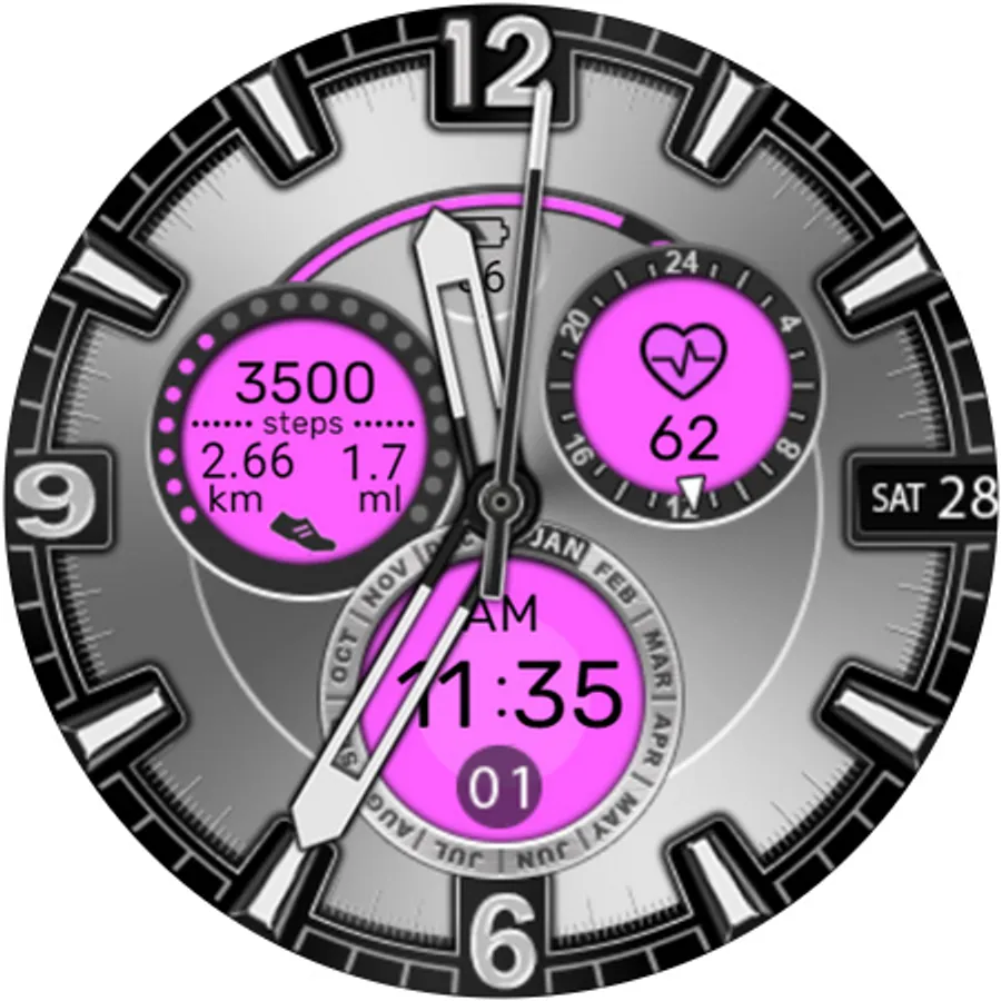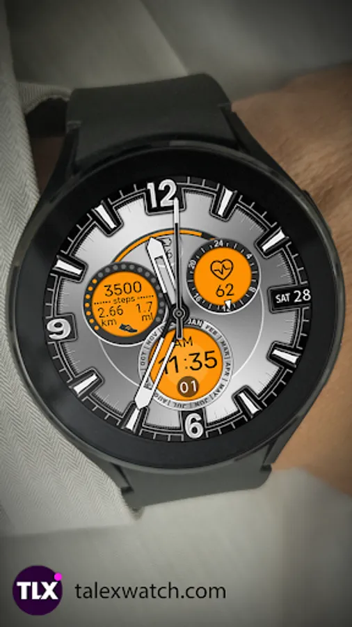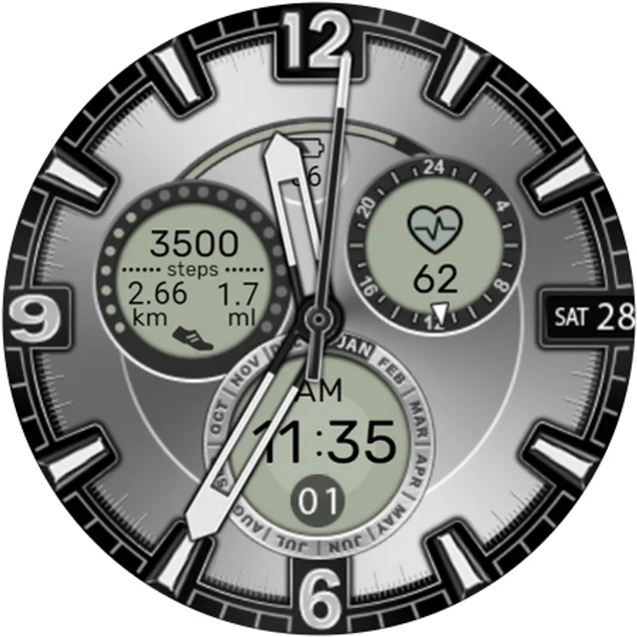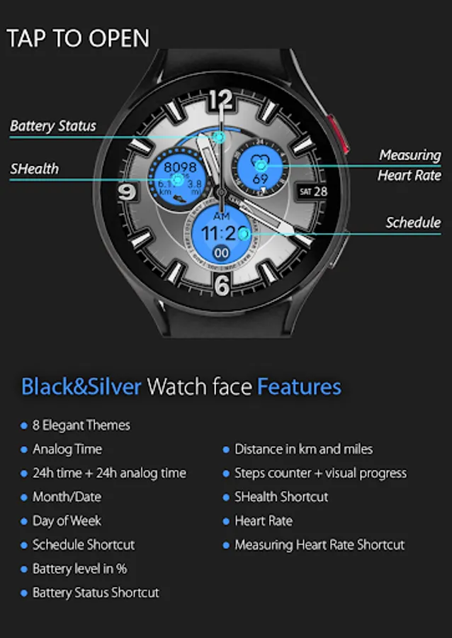Black Silver Watch Face features date, weekday, battery percentage, step counter, daily step goal, moved distance km and miles and shortcuts (battery status, step counter and shedule)
