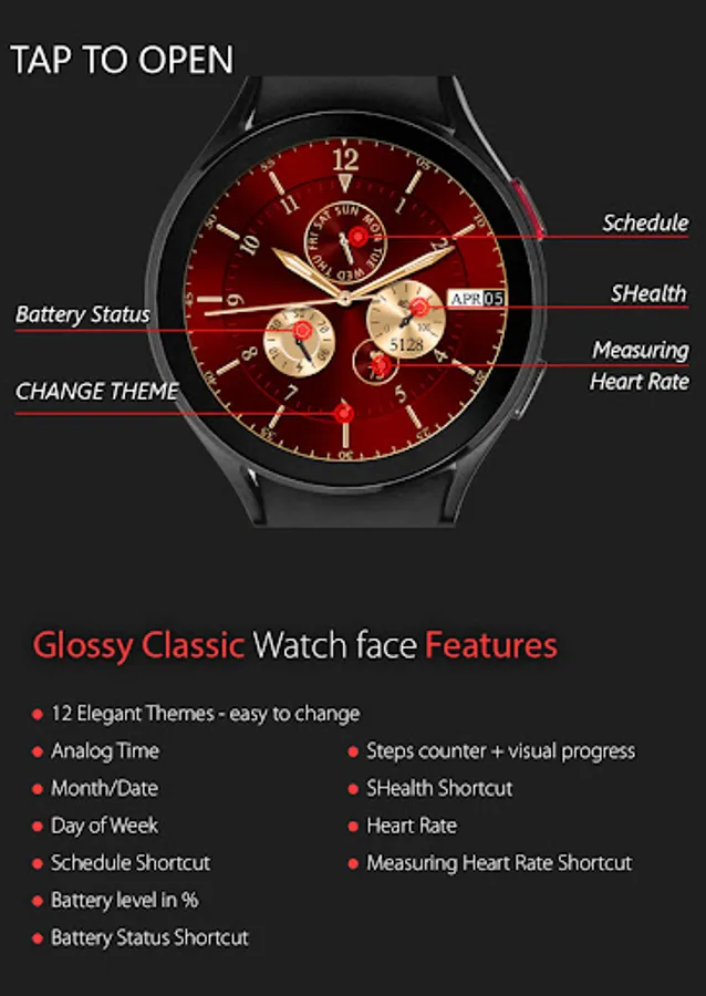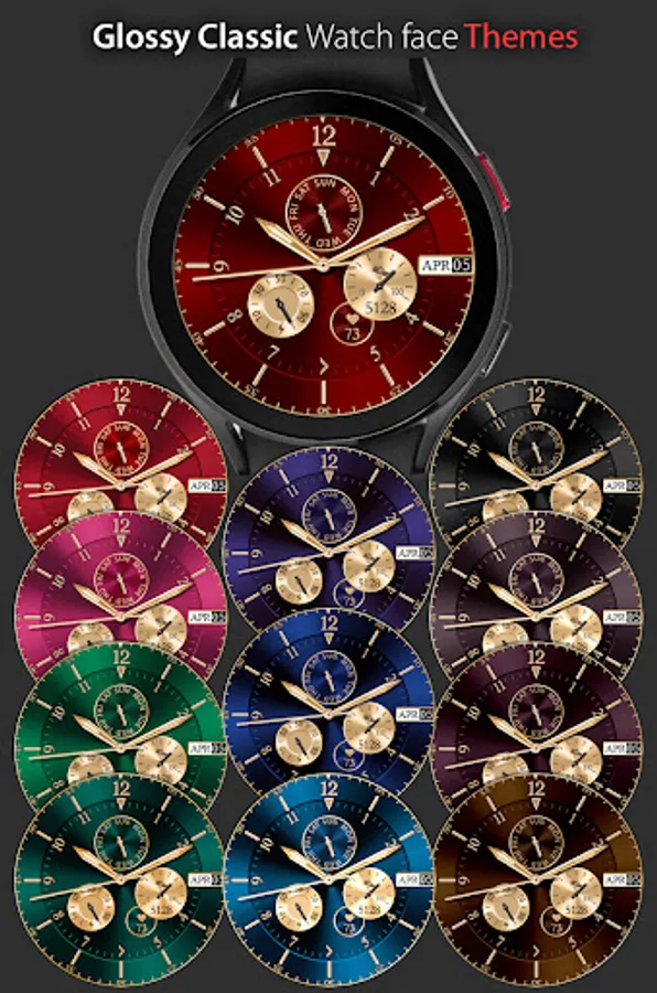 Glossy Classic Watch - bright and beautiful interactive watch face with 12 great Color Themes.