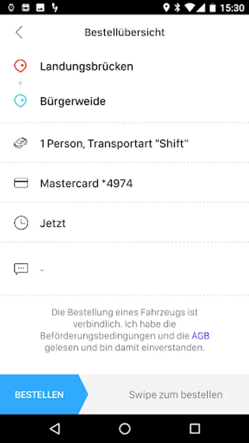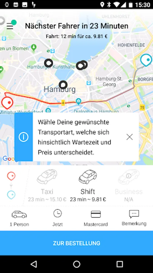 Welcome to Shift, your individual mobility app. After entering your destination, choose between the modes of transport Taxi, Shift and Business. With Shift you book a car that is subject to free pricing and can therefore be cheaper. Under Business you will find luxury cars. So you can choose the mode of transport that suits you best. Have fun and have a good trip!