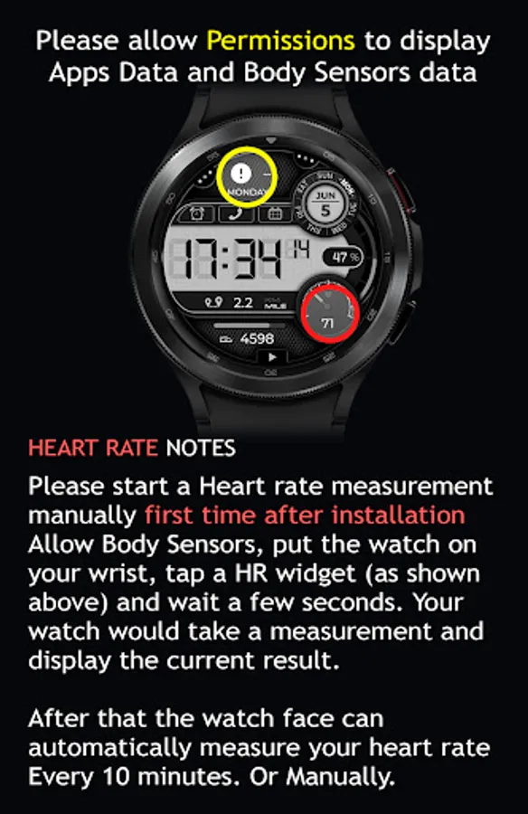 Please start a Heart rate measurement manually first time after installation Allow Body sensors, put your watch on your wrist, tap a HR widget (as shown above) and wait a few seconds. Your watch would take a measurement and display the current result.
