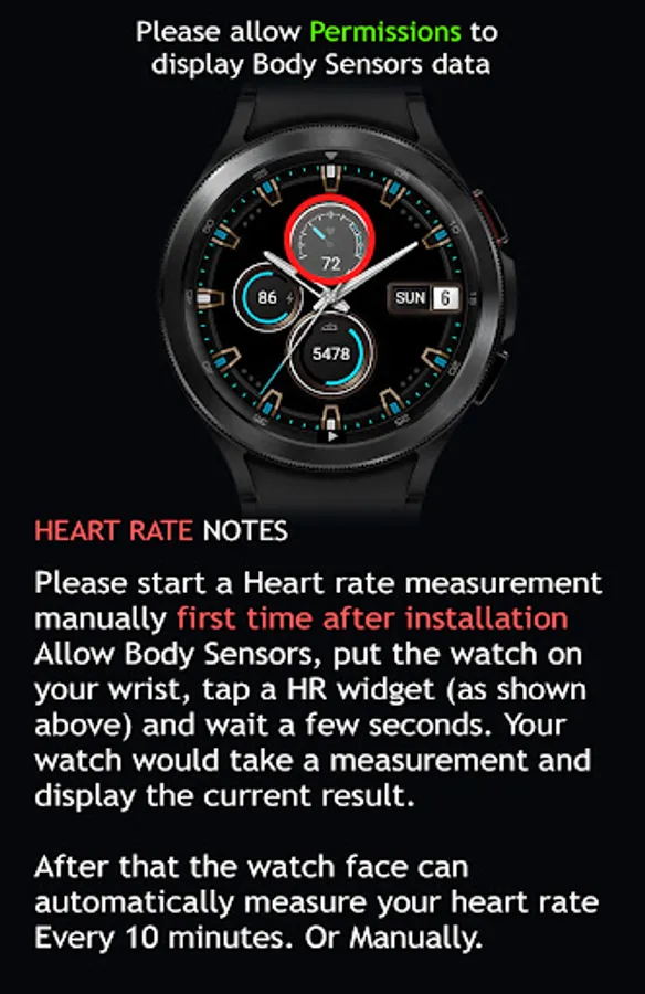 Please start a Heart rate measurement manually first time after installation Allow Body sensors, put your watch on your wrist, tap a HR widget (as shown above) and wait a few seconds. Your watch would take a measurement and display the current result.